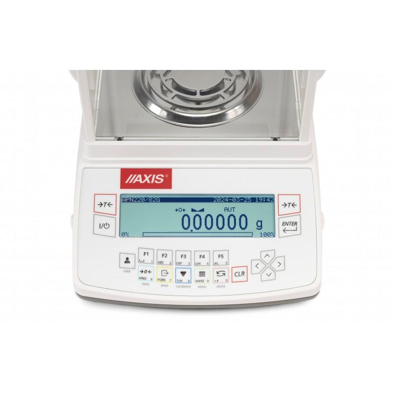 Analytická váha s dílkem 0,1 mg (0,00001 g) do 120g . Váha APN-G 220 je analytická váha vybavená mnoha rozhraními. Rozhraní USB-B a USB-A umožňují výměnu dat s počítačem a tiskárnou, klávesnicí nebo externím datovým médiem. Váha je navíc vybavena rozhraním LAN, díky kterému lze váhu připojit k počítačové síti. RS232C lze použít například k připojení čtečky čárových kódů. Každá profesionální analytická váha zařazená do řady APN/G má rozsáhlé rozhraní v podobě klávesnice (složené z funkčních a numerických kláves), která umožňuje rychlý výběr požadovaných funkcí. Zařízení dokáže podporovat rozsáhlou databázi, která obsahuje informace o: produktech, uživatelích, měřeních. Váha má také prostornou vážicí komoru, která je ze tří stran uzavřena posuvným sklem. Paměť Alibi dokáže uložit až 100 000 měření. Navíc je možné tato data přenést na disk počítače a později je archivovat na něm.