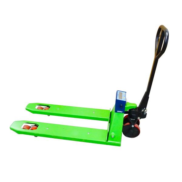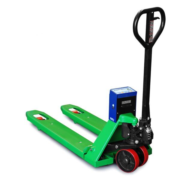 Paletový vozík s váhou DINI ARGEO model TPWNBTW-2 do 2000kg s širokými vidlicemi v lakovaném provedení.