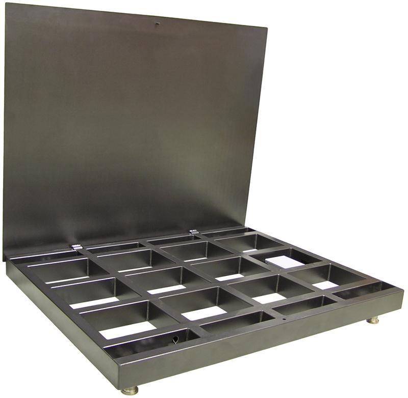 Konstrukce je zhotovena z ocelových profilů, které jsou opatřeny komaxitovým nástřikem.Provedení: vrchní krycí plech - ocelový rovný plech optatřený komaxitovým nástřikem s možností odklopení.Použití: Tyto váhy jsou určeny pro vážení jak v obchodním styku, tak pro kontrolní vážení. Jejich umístění je zpravidla přímo na podlahu nebo pro zapuštění do podlahy. Vážící plošina je vhodná do suchého prostředí a provozů, ve kterých nepřichází do styku s agresivními látkami.