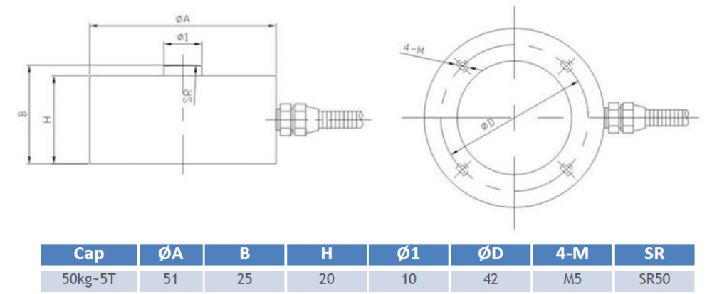 Siloměr se skládá z indikační jednotky a z externího snímače pro zatěžování v tlaku. Snímač je s indikační jednotkou pevně propojen. Rozpojitelné propojení konektory je za příplatek. Kapacita 1kN.